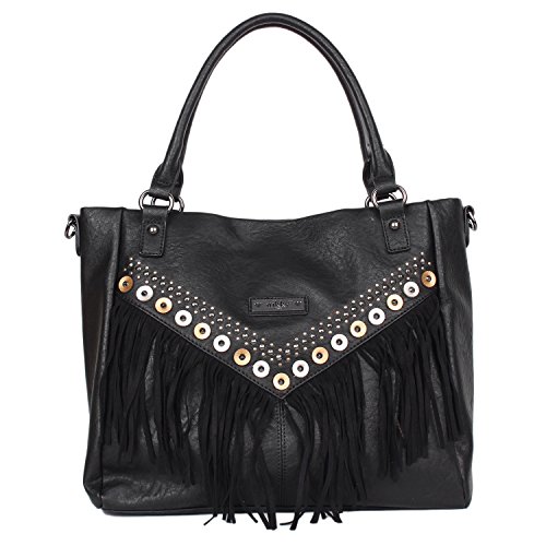 Nikky Women's Fashion Fringe Design Studded Spacious Tote Shoulder Bag, Black, One Size