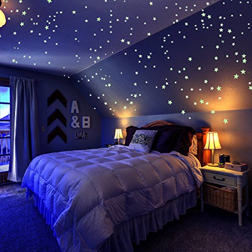 FEELS LIKE BEING UNDER THE STARS LIGHT- With this glow in the dark galaxy set,it adds the look of a real night sky. In the morning it's blue look, the stars and moon merge with the ceiling or wall.In the dark the room become to starry shiny bedroom