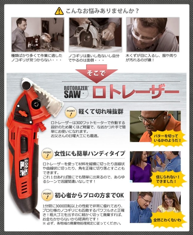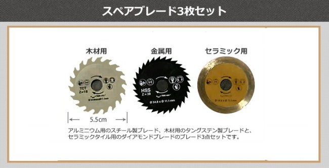![]() ![]() ![]() ![]() ![]() ![]() ![]() 【セット内容】Rotorazer本体、スペアブレードセット(タングステンブレード、スチールブレード、ダイヤモンドブレード)、六角ソケットレンチ(3mm)、六角ソケットレンチ(5mm)、ダスト排出ホース、専用保管ケース 【箱サイズ】11×33.3×24.3cm 【重量】Rotorazer Saw 1.2kg 【製造国】中国 専用スペアブレード 【サイズ】直径: 約5.5cm 【重量】スチールブレード:約13.0g、タングステンブレード:約15.0g、ダイヤモンドブレード:約21.0g 【製造国】中国 |