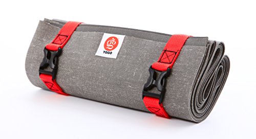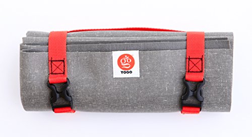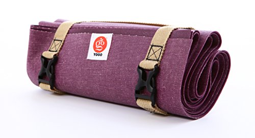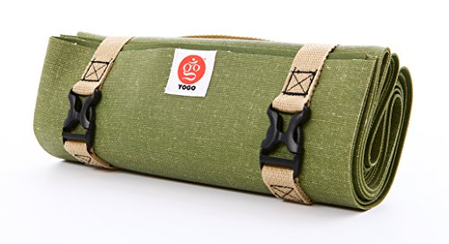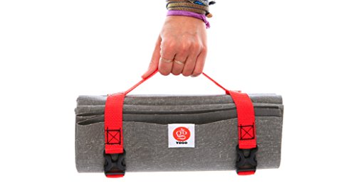 The YOGO Ultralight travel yoga mat has a super-compact folding design and integrated straps that stay attached. It is a full size yoga mat when open, but folds to the size of a newspaper. 2.6 pounds, 24 inches x 68 inches when unfolded. Patented, folding origami design keeps the top clean because it never touches the bottom (regular mats roll dirt on top). The durable straps and buckles double as a hanging system so you can rinse and dry in the shower. Its slim profile gives you just enough protection while allowing it to fit in a purse or backpack. Award-winning, super sticky mat material. It combines biodegradable natural rubber with a cotton mesh heat bonding to keep the mat from stretching. The Rubber is harvested from long-term sustainable plantations in Asia. For every mat sold, YOGO plants a tree in Central America and gives training in organic farming to local communities, providing them with a sustainable alternative to deforestation. The YOGO Mat was selected for Yoga Journals Gear of the Year collection in 2014.Feature