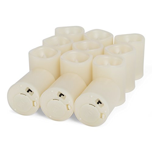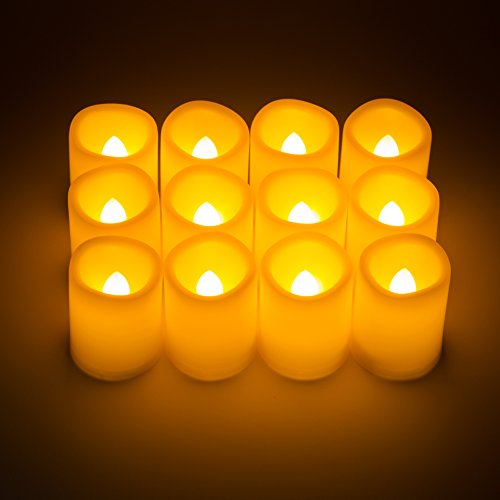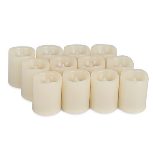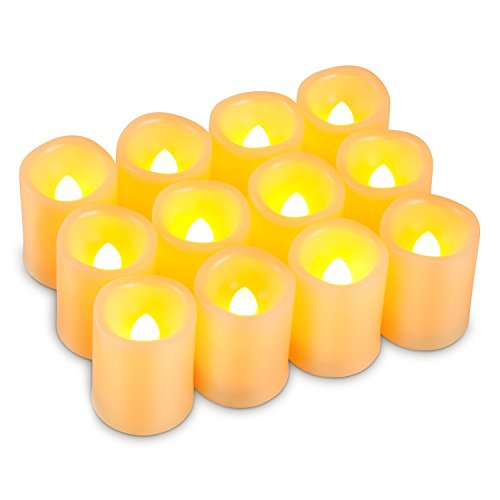 Set of 12 unscented, votive flameless candles. Dia. 1.5"x1.9" Height. Build in 6-hour on/18-hour off timer. The candles turn on and off automatically every day