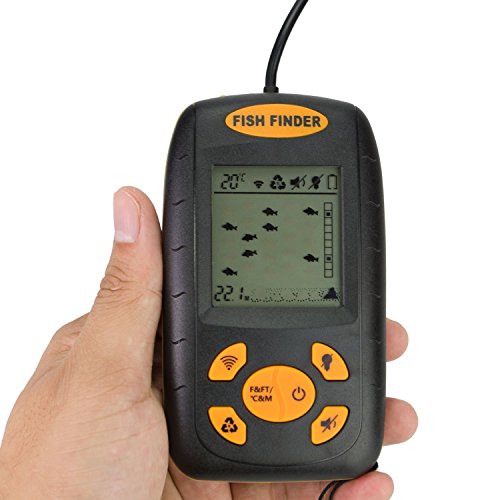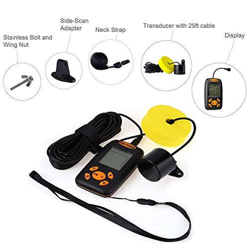 - MULTIFUNCTIONAL-- The portable fish finder is designed for amateur and professional anglers to find and locate fish easily with high sensitive sonar sensor. The round transducer sensor with 25 ft cable and removable transducer float can be used for fishing off dock, on the boat and also ice fishing. When using on boat, please make sure the moving speed is lower than 5 mph.