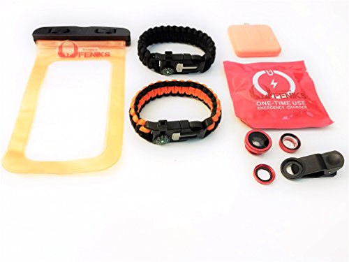 -. Feature : WATERPROOF PHONE POUCH -Offers waterproof / snowproof / dirtproof/ mudproof protection for your device while maintaining full touch screen. The pouch is waterproof up to10 meters deep. Great for pictures in and under water. Easy snap-N- lock Seal. Compatible for phones up to 4- 6 inches. HD Clear Window on front and back perfect for taking picture storing personal items. Perfect for beach, fishing, swimming, snorkeling.etc (Fits Phones up to 6 inches) / LIGHTWEIGHT 5-in-1 TACTICAL SURVIVAL BRACELET- KIT includes; Flint, Compass, Whistle, Para-cord, and Scraper/Knife. and fits most adults with (Med-Lg 5.5-9 inches) Strong enough for Great to use in any situation. Wear on your wrist or clip to pack. / UNIVERSAL 3-in-1 PHONE CAMERA HD LENS (Red Frame) - Kit includes: FISH-EYE, MACRO .67x zoom, and WIDE-ANGLE LENS. Macro lens to take clear photos of small objects; Wide angle lens to capture high quality images when shooting scenery (Landscapes, Horizons, Seascapes, Beach ,etc) NOTE: Better fit when phone case is removed before attaching. Cell Phone Lens for iPhone 8, 7, 6s, 6, 5s & Samsung & Smartphones. / (2 PACKS) 1000Ma EMERGENCY DISPOSABLE POWER BANK & CHARGER- iPhone 8, 7, 6s, 6, 5s, 5c, 5 & Samsung & Smartphones. Emergency One time use. CHARGES phones 10-40% with 30-75 min charge time. Materials can be recycled. Instructions for use: 1. Open packaging by tearing along the top. 2. Remove protective rubber tip from adapter. 3. Pull white tab to engage charge. 4. Insert into phone. Standard 5V device charging. If you have any problem about your purchase, please contact us