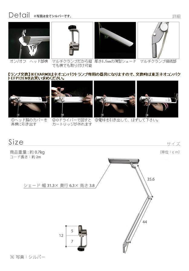 サイズ(cm):シェード31.3x6.3x3.8、アーム35.6+44・約0.7kg、コード長さ約2m