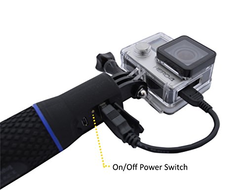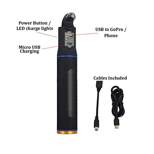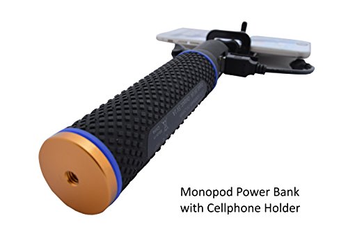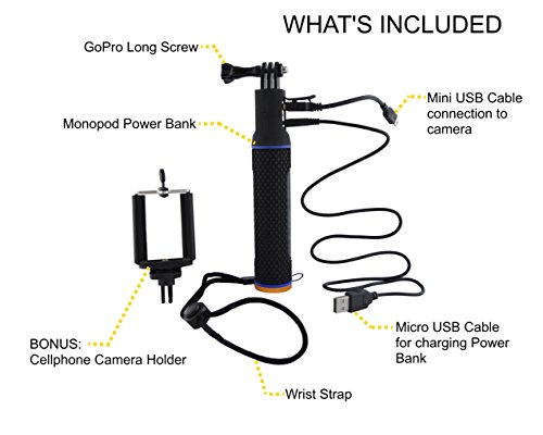 WHY BUY THIS? 1) This monopod with an integrated power bank will extends film time up to 10 hours (4+ batteries worth of power) & makes your camera stay powered during marathon surf sessions, scuba diving, overnight backpacking, and other activities where charging or swapping in a fresh battery is difficult. 2) Multiple use - Charge your GOPRO (all models) or charge your phone (Cell Phone Holder is included to serve as Cell Phone Selfie Stick) or charge any USB powered devices 3) Use it as Selfie Stick