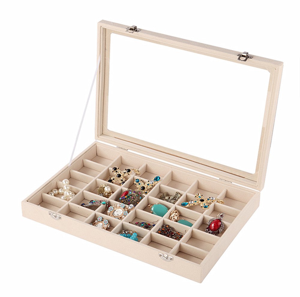 ガラスの蓋がついているので、中身が見えて、埃もつかないので、使いやすいです。 ベルベット調で手触りはよくそれなりの高級感もありコレクションを眺めるのにも最適です。 蓋とベースは丈夫で、設計も良くて、非常に実用的なジュエリーボックスです。 指輪、ピアスやイヤリングの整理にとても便利で使いやすいです。 サイズ35 x 24 x 5cm 区画サイズ5.5 x 4.5cm