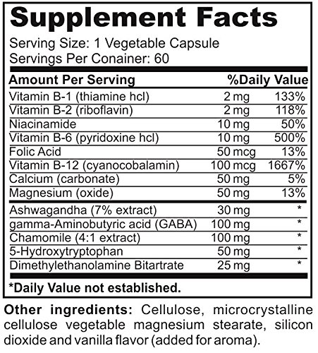 -. Title : Natural Stress and Anxiety Relief Supplement Pills - Natural Herbal Support for Anxiety, Stress Relief and Mood Enhancement with Ashwagandha, 5-HTP, GABA, DMAE & Chamomile - 60 Vegetable Capsules