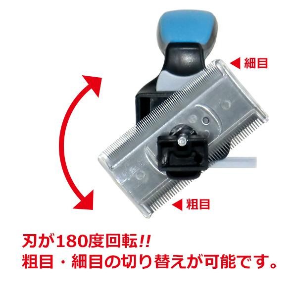 刃が180度回転する、シェッディングブラシです。粗目・細目の切替が可能で、刈れた毛はプッシュボタンで簡単に取り除けます。中型・大型犬におすすめのサイズです。 |