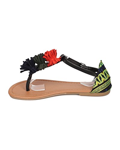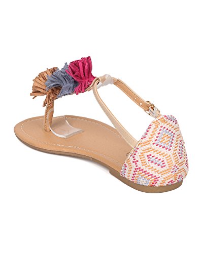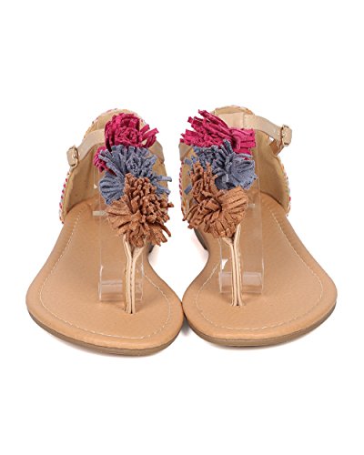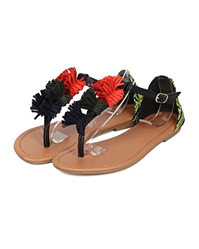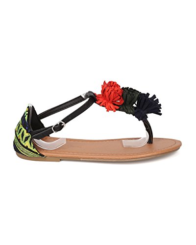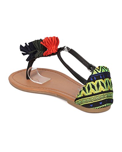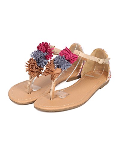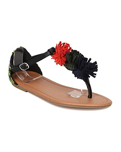 Product Description These pom pom sandals are made with an open toe, t-strap construction, and fringed pom pom details. Also made with a tribal print design, flat heel and ankle strap with adjustable buckle closure. 0
