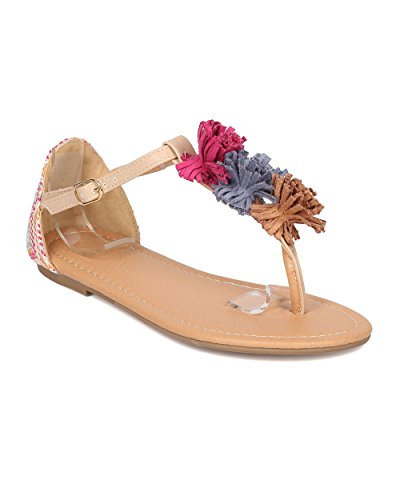 Women Pom Pom Flat Sandal - Tribal T-Strap Sandal - Fringe-Pom Sandal - HA64 by Wild Diva