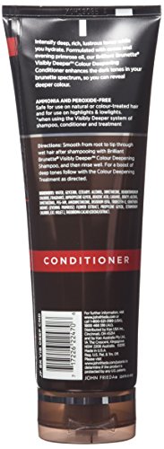 ReleaseDate : 2016-01-01 Studio : John Frieda Publisher : John Frieda Binding : Health and Beauty Product Description Intensify deep, rich, lustrous tones while you hydrate. Formulated with cocoa and evening primrose oil, our Brilliant Brunette Visibly Deeper Color Deepening Conditioner enhances the dark tones in your brunette spectrum, so you can reveal deeper color. 0