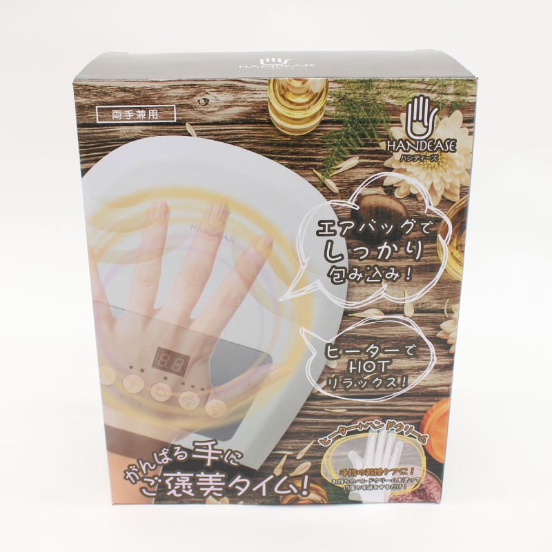 | 商品説明 | 全国送料無料!(沖縄、離島は出荷不可となります) 家事やスマホ、パソコンなど休みなく働いている手指にご褒美を。 知らず知らずに酷使している手や指先をエアバッグでしっかり包み込んでもみほぐします。 操作はカンタン!手を入れてボタンを押すだけ☆ ヒーター機能搭載であったかリラックス♪ お手持ちのハンドクリームを塗ったあと、ビニール手袋を装着して使用すると手指の乾燥ケアにも効果的! ACアダプター&電池式の2WAY電源で場所を選ばず手軽にお使いいただけます。 オフィスやご自宅のリビング、寝室で、好きな場所で好きな時にリフレッシュタイムを。 本体サイズ:約 W210xD265xH95mm 重量:約 1077g(電池除く) パッケージサイズ:約 W230xD112xH290mm パッケージ込重量:約 1272g 入力電圧:電池(単3形×4本(別売) /ACアダプター(5V=1A) 消費電力:電池(6W) /ACアダプター(5W) セット内容:本体、ビニール手袋(6枚)、ACアダプター、USB-DC5V電源供給ケーブル、取り扱い説明書 規格 ■生産地:中国 ■素材・成分:ABS、PA6+CF、シリコン |