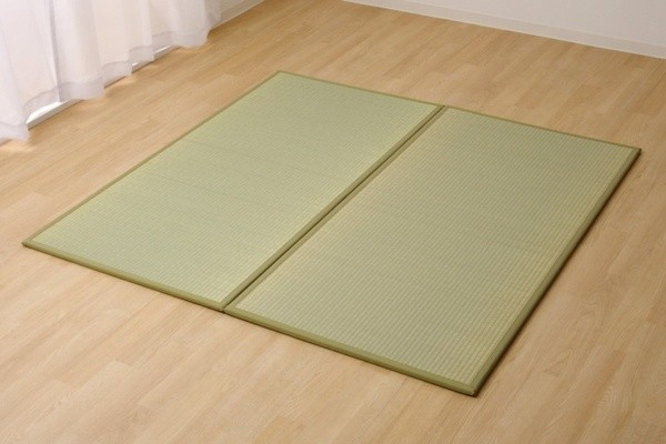 届いたユニット畳を床に置くだけで和のスペースが出来上がります。表生地には国産(九州産)のい草を使用しています。一本一本が太く、表皮が厚く繊維がキメ細かいので弾力性があり、耐久性に優れています。い草には空気の自然浄化作用、湿度の調節作用などがあります。また汚れにくく、使用するうちに黄金色に変化し、味が出ます。中材には10mmの硬わたを使用しておりますので適度なクッション性があります。裏地には滑りにくいウレタンフォームを使用しています。青森県尾ヒバの木から抽出した「ヒバエッセンス」をメーカー独自の技術で生地表面に加工しました。ヒバエッセンスにはヒノキチオールという、天然物物質としては極めて抗菌性の高い成分が含まれています(無加工品に比べ抗菌、防臭効果)。また軽量タイプなので、持ち運び、設置、片づけなども楽にできます。