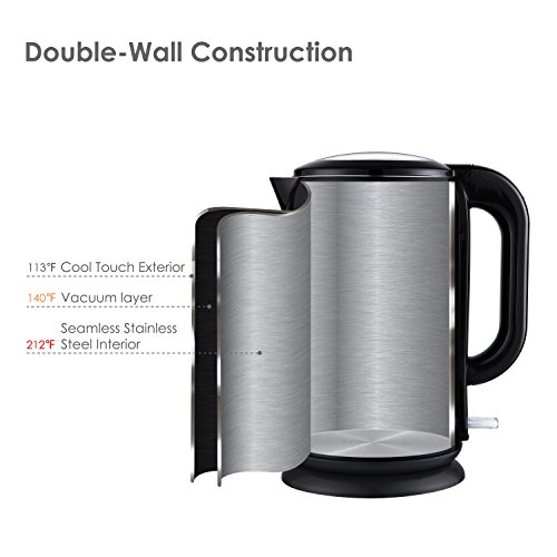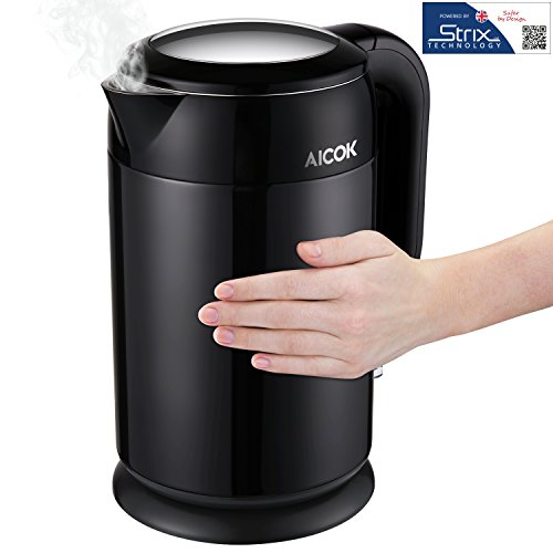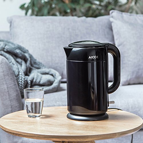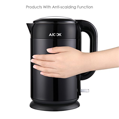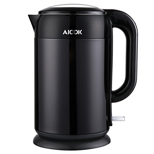 Aicok Wasserkocher Edelstahl, Elektrisch Doppelwandig Wasserkessel, Kabellos Schnellwasserkocher, BPA-Frei, Anti Kalk, Fruhstucks-Set, Schwarz 2200W 1,7 L