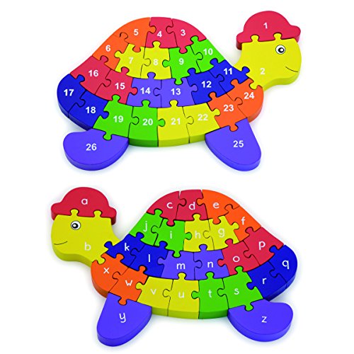 Dieses 3D-Holzpuzzle lehrt Kinder das Alphabet und die Zahlen, wahrend sie eine Schildkrote zusammenbauen. Auf der einen Seite sind die Buchstaben A bis Z und auf der anderen die Zahlen 1 bis 26.