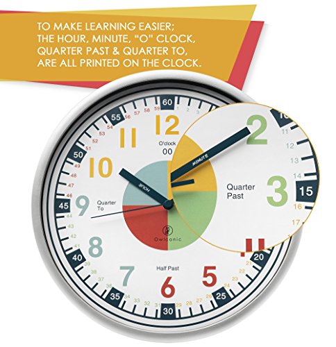 -. Feature : YOUR KIDS LEARN THE TIME with our specially designed analog kids wall clock that lets them see what time it is using colored numbers. With each quarter broken down into a specific color, it's easier than ever for your kids to remember and retain where each minute is. Telling time on our timepiece is easier than ever, and teaching children is a breeze thanks to helpful references like "o'clock," "quarter past," "half past," and "quarter to." / YOUR CHILD GETS ALL THE INFORMATION THEY NEED on our educational clock. For kids to learn time efficiently our design had to be easy to understand, labeling each quarter with a different color would provide an easy way for your child or toddler to quickly create an association between the numbers and where they are. Each hand is also labeled in order to avoid any possible confusion, every minute is represented on the clock, meaning your child will always be able to see the exact time. / SIMPLY DESIGNED FOR EASY TEACHING. At Owlconic we designed the clock to help when we were teaching our own child better learn how to read time. She was unable to learn the time using any other time clocks for kids, so we knew we had to create one that was simpler while still being educational. Our child was able to learn to read time thanks to this design, and we wanted to share it with other parents whose kids were learning time. / WE EVEN MADE IT SAFE & EASY TO CARE FOR! With easy to find AA batteries being the power source, it's easy to keep this educational clock in working order. Our children's clock is also easy to clean, with a safe clear acrylic face that allows you to quickly and efficiently wipe off any gathered dust. Made from good quality non-toxic plastic, with lead free paint. A lightweight clock that can be placed anywhere, from a classroom's wall to just above a kid's nightstand in their room. / AN ASSET TO ANY CLASSROOM OR BEDROOM. Our clock makes an ideal gift for anyone in your life who works with young children, or as a gift for your own child. The color coded clock keeps them engaged and makes the process of learning time easier for kids. The Quartz silent sweep movement makes it great silent addition for a preschool or elementary school room. Put it up on the classroom wall and our analog clock is guaranteed to make it significantly easier for all the children to understand time.