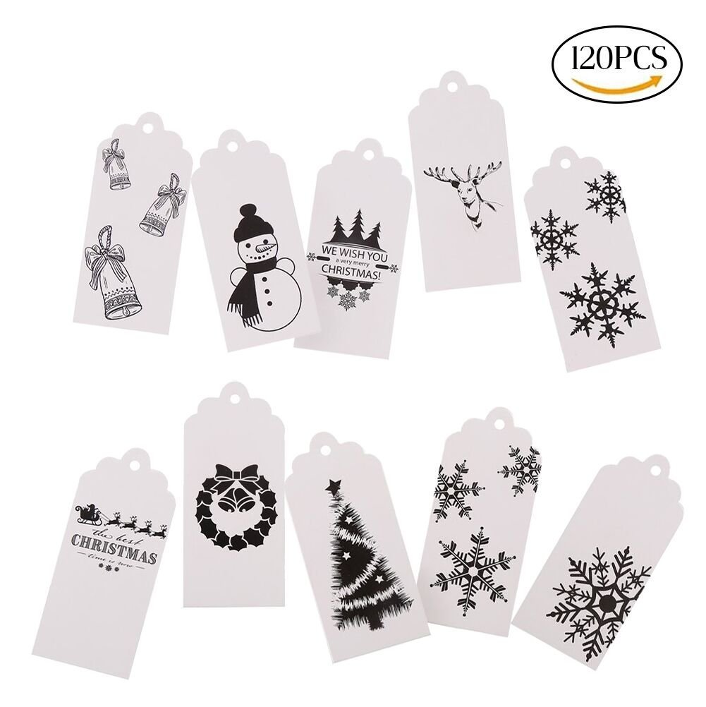 【サイズとカラー】:43mmx93mm   カラー:白い 【入り数】:120枚入り+600cm付き(茶褐色麻紐300cm+カラフルな紐300cm) 【10種類図案付き】:クリスマス鈴、雪人、WE WISH YOU A VERY MERRY CHRISTMAS、麋鹿、雪花、サンタクロース、クリスマスリース、クリスマスツリー 、雪の結晶共10種類です。120枚には、毎種類10枚+2種類の雪の結晶(3個)各10枚セットです。 【おすすめ】:色々な図案が付いてこの値札は、様々な場合に使えます。ヴィンテージタグは、、ギフトタグ、学生の単語カードなどにおすすめです。このタグにお話したいことにを書き、大切な人にクリスマス 祝福を伝えましょう!