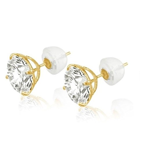 Designed with flair crafted with care. These exclusive stud earrings brilliant round cut white cubic zirconia are embedded in solid 14K gold. The simulated diamonds are professionally hand-set into a basket setting that secure and fasten the stone. The setting is designed to fit comfortably and secured with a padded silicon post. These stud earrings are essential to complete your collection and forms a timeless look that radiates the desired elegant appeal. Feel like royalty with these earrings that are classy yet affordable. To preserve the original condition of the gemstone we recommend routine maintenance. Clean with warm water, mild soap and a soft brush then rinse thoroughly. Avoid contact with lotions, hairsprays or any other chemicals that may damage the original properties. Dry and store in a soft cloth pouch to prevent dulling or scratches.