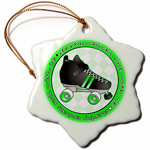 3dRose Derby Chicks Roll with it Green with Black Roller Skate Snowflake Porcelain Ornament, 3-Inch