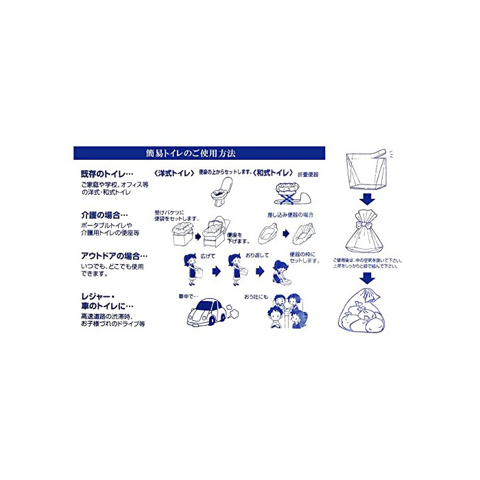 단수 시 등에 화장실로 세트 하는 것 뿐(만,만큼)!개호용 화장실이나 포터블 화장실,아웃도어 에서의 사용으로도 적합하게 있습니다. 사용 후는 불타는 쓰레기로서 버려집니다.