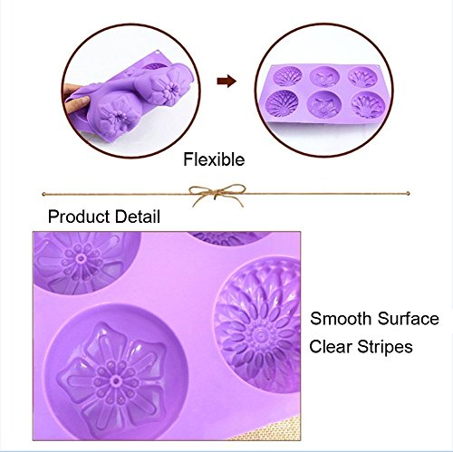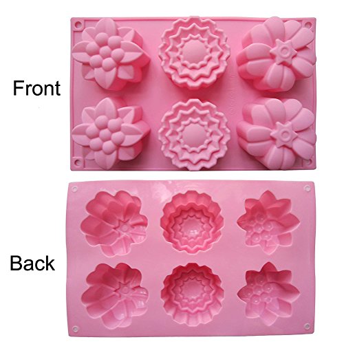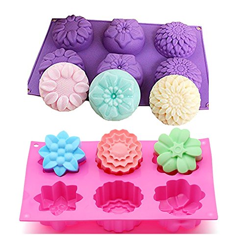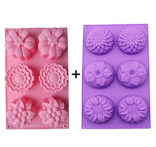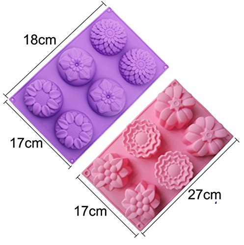 Kakasogo 2 PCS 6 Cavity Assorted Flower Shapes Silicone Soap Mold for Handmade DIY Cake Chocolate Cupcake Biscuit Bath Bomb Bread Muffin Candle Ice Cube Making Mould Tool Set(Pink and Purple)