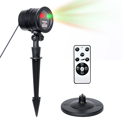 -. Feature : Magical Illumination---The Christmas Tree, Santa Claus, Snowflake and Bells Patterns create a perfect Christmas atmosphere. / Wide Coverage---Covers more than 3800 square feet from a distance of 35 feet with thousands of red and green lights, allows every space to take part. / Wireless Control---color choice(red, green or red & green), timer setting (2, 4, 6 or 8 hours duration),moving speed choice and flashing mode capability. / Premium Quality-- laser holographic technology to project breathtaking stars onto any surface, Laser Class 3R with Certificates of FDA UL CE and ROHS. / Easy Installation---Outdoor, just plug the stake into the Lawn, no risk of climbing to the tree or other dangerous place; Indoor, install the projector to the flat base, place it anywhere you like.