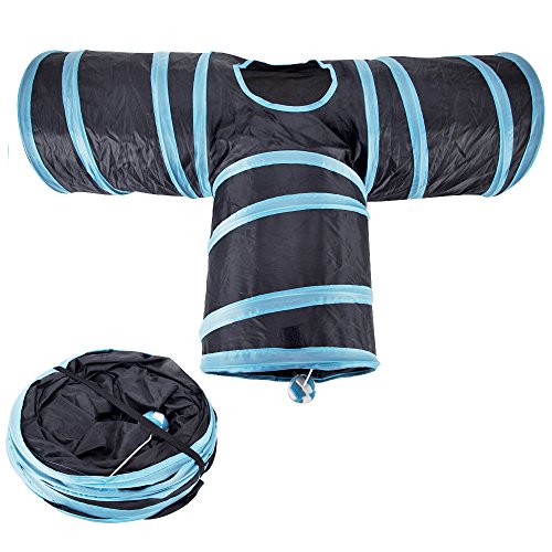 - Self-Amusement and Puzzle Entertainment --- This toy with 3-way junction tunnels, built-in crackle paper with a jingle ball, which provides your kitty more ways to have fun. It provides hours of exercise and self-amusement when you are busy not at their around.