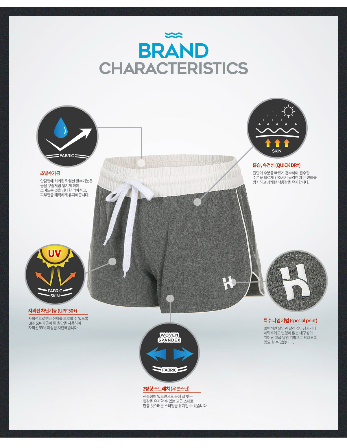 가볍고, 신축성 있는 원단으로 활동하기에 편하며, 건조가 빨라 물놀이에 적합합니다.