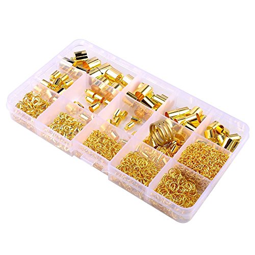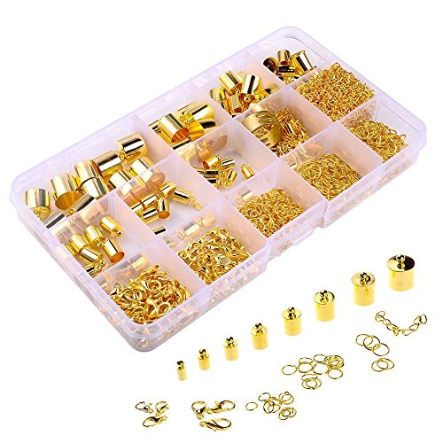 Supla (930 sets) Gold Plated Barrel Leather Cord Ends Cord End Cap 4mm-12mm, Lobster Clasp 10mm 12mm,jump ring 4mm-7mm, jump ring open tool and Extension Chains Kits Assorted Pack