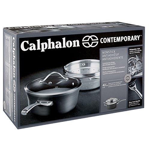 Dishwasher safe for easy cleanup, the Calphalon Contemporary Nonstick 4.5-qt. Sauce Pan with Steamer Insert is created with multi-layer non stick for ultra durability. The stunning, contemporary design looks beautiful in the kitchen, and heavy-gauge, hard-anodized aluminum ensures even heating. One of the most commonly used pans in the kitchen, the large non stick saucepan has high sides and a rounded bottom for easy stirring. Ideal for soups, sauces, noodles, rice and mashed potatoes. The removable stainless steel steamer insert can be used to steam potatoes, shrimp, vegetables and more. Includes tempered glass cover.