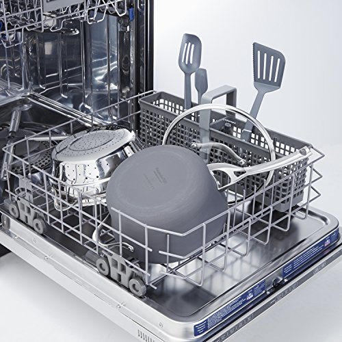 Heavy-gauge aluminum construction ensures even heating and is hard-anodized for durability. It also makes it dishwasher-safe.