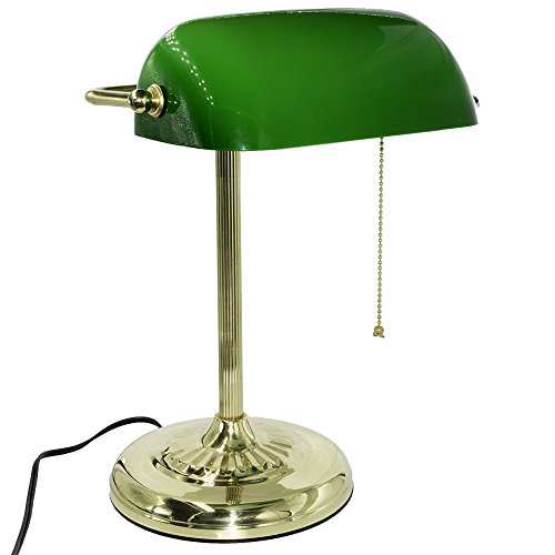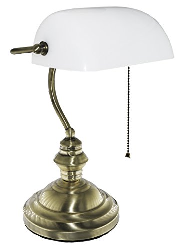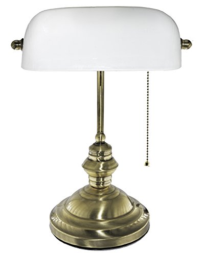 This beautiful Bankers' Desk Lamp is of traditional design and timeless style. It comes with a white glass shade with a brushed or polished gold finish for unparalleled elegance. It measures approximately 15"H by 9 1/2" W and the brass base is of 7" diameter.Not only can this beautiful Bankers' Desk Lamp serve as an elegant addition to any home or office, but it is also fully functional and works bulbs (Not Included) up to 40W. The on/off pull chain is located on the socket and the 6' power cord is sufficient for most environment. Elegant, Functional and of BEST value!Feature