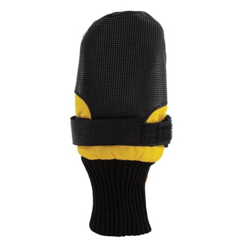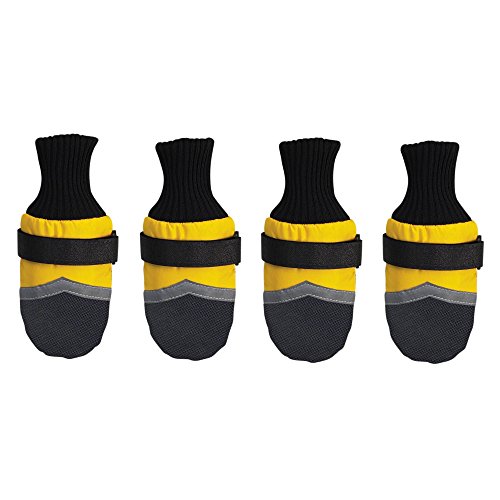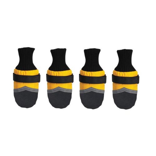 Product Description Protect your dog's feet from the elements. Guardian Gear Dogs Boots provide durable, long-lasting protection during any outdoor activity. Boots keep paws safe and dry and help prevent injuries from heat, cold, ice, salt, stones and abrasive surfaces. Made of breathable, water-repellent fabric with tough vinyl soles and toes. Stretchy, ribbed knit cuffs add comfort, and adjustable Velcro straps keep boots snug and secure. Decorative reflective strip increases visibility. Colors available: Blue with Black trim; Pink with black trim; Yellow with black trim. Available sizes: XXX-Small fits up to 1 1/2 in; XX-Small fits 2 1/4 in; X-Small fits 2 3/4 in; Small fits 3 1/4 in; Medium fits 3 3/4 in; Large fits 4 1/4 in; X-Large fits 4 3/4 in; XX-Large fits 5 1/2 in.