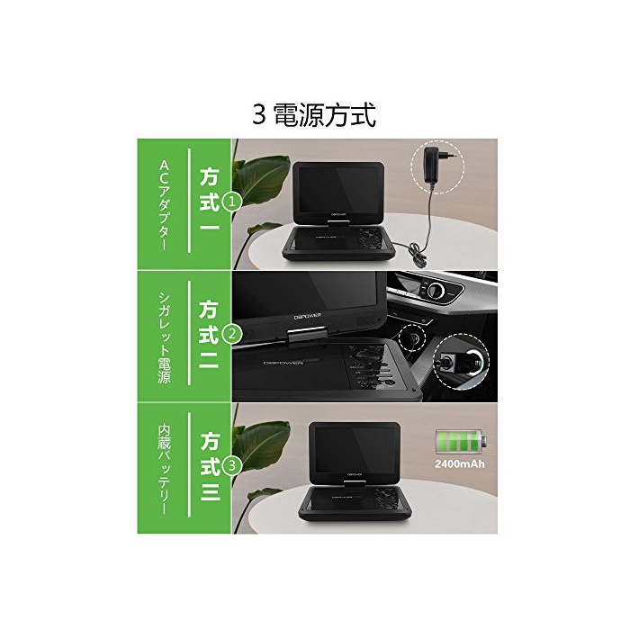 【3계통의 전원2500mAh대 용량 공부에 적용】DVD플레이어는 2500mAh배터리가 내장 해 있기 때문에,3시간 이상 사용하는 것 를 할 수 있습니다.배터리 구동,《시가소켓토》,AC어댑터의 3계통의 전원에 대응에서 옵니다.AC용의 어댑터,차용의《시가소켓토》가 부속 하고 있기 때문에,장소를 선택하지 않고 사용으로 옵니다.(차용의《시가소켓토》는 12V의 차 아무리 대응할 수 없습니다.) 여행 중 장시간 드라이브 시,이동 중의 지루한 시,아이에의 최고의 선물입니다!아이가 기쁨이면서,자신도 안심에 운전에 옵니다.장거리 운전은 완벽합니다!게다가아이의 공부로도 도움이 될 수 있습니다.