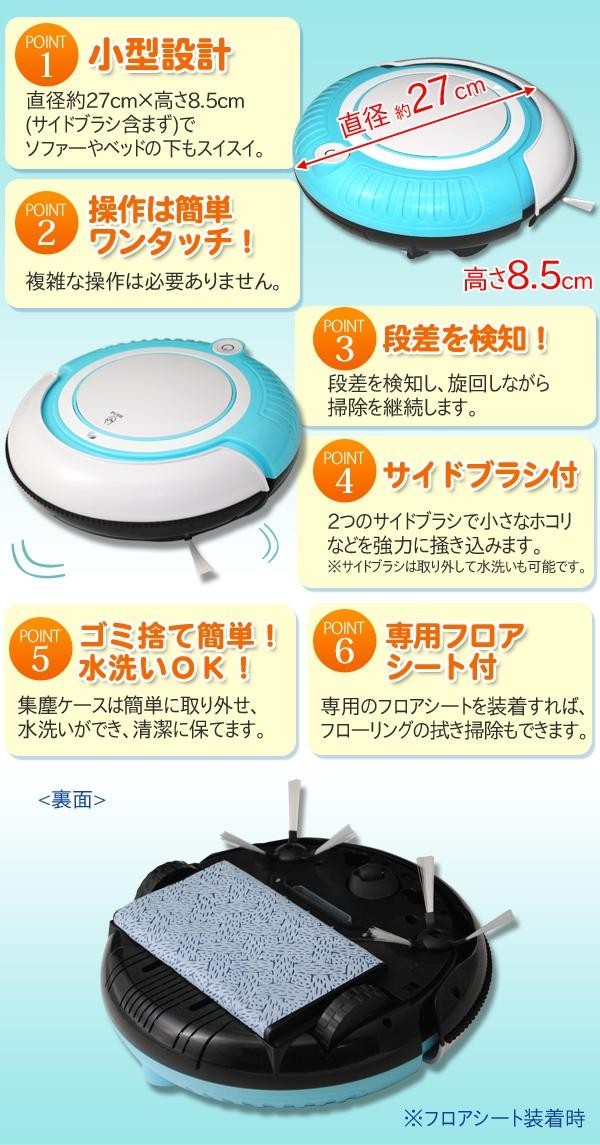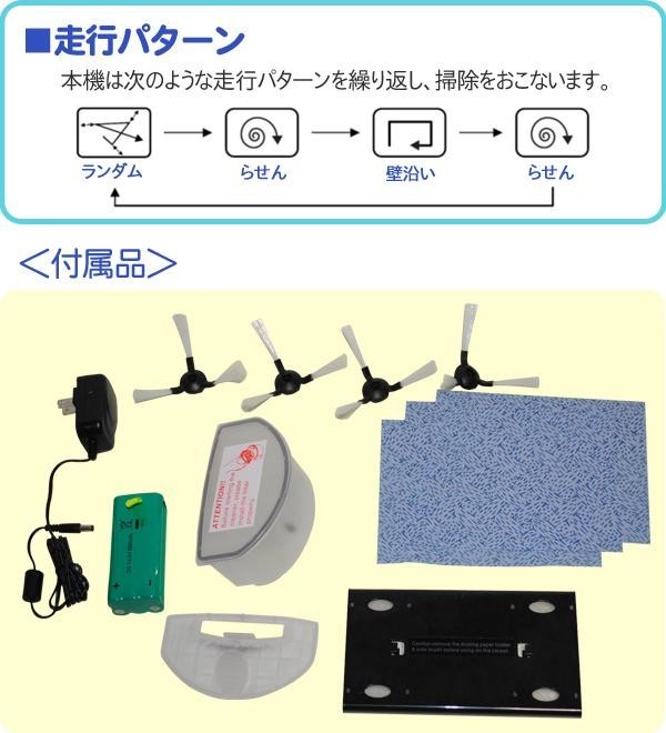 | 付属品 | サイドブラシ左右×各2ずつ フロアシート×3 集塵フイルター×2 フロアーシートホルダー×1 ACアダプター×1 取扱説明書 保証書(保証期間1年) |