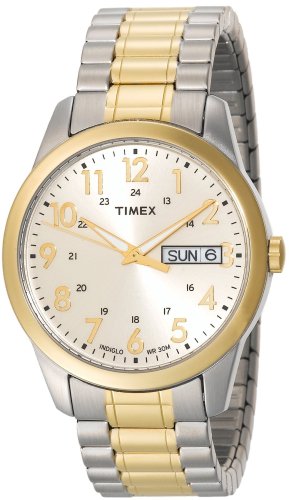 Studio : Timex Publisher : Timex Binding : Watch Product Description The Timex Men's T2M935 Two-Tone Analog Stainless Steel Watch from Timex is a fashionable addition to the modern man's wardrobe. A large round, brass bezel is backed by a polished, stainless steel case, and the trendy, two-toned design continues through the expansion band bracelet with its wide, brass center and polished, stainless steel exterior. Straight, brass, Arabic numbers mark the hours, and concise, black Arabic numbers mark the 24-hour clock on the interior ring. Luminous brass hands and the traditional Indiglo® night-light backing the yellow dial make this watch easy to read no matter what the light source. A convenient calendar display at three o'clock shows both the day and date. 0
