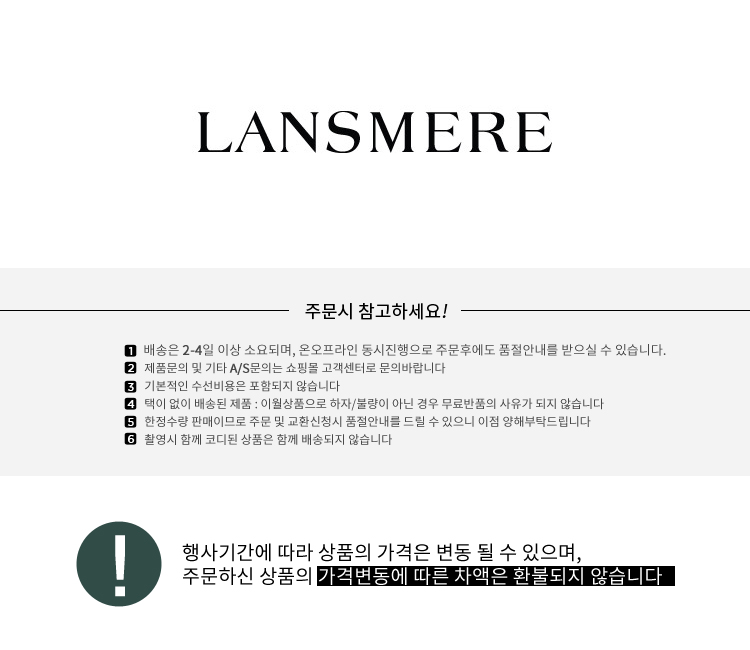 - 1. 이 제품은 반드시 세탁전문점에서 드라이클리닝하십시오. 2. 연한 색상의 제품은 반드시 깨끗한 용제로 드라이클리닝하십시오. 3. 드라이클리닝 시 단추와 액세서리는 반드시 은박지를 씌우십시오. 4. 물에 젖거나 땀이 많이 묻으면 이염, 변색, 탈색될 수 있으니 신속히 세탁하십시오. 5. 제품은 뉘어서 보관하십시오. 6. 화기에 가까이하면 불이 옮겨붙을 수 있으므로 주의하십시오.