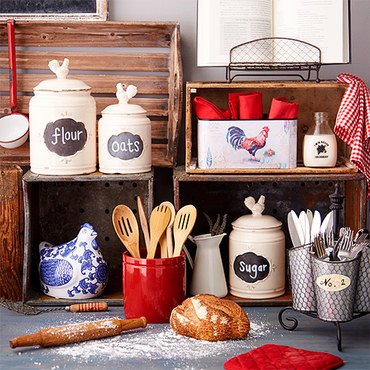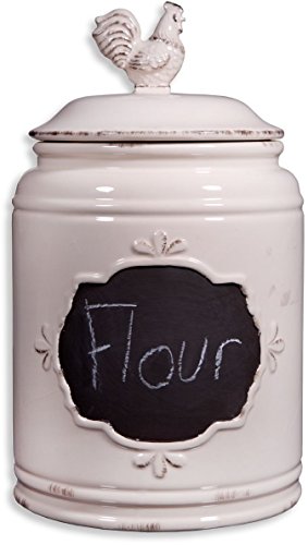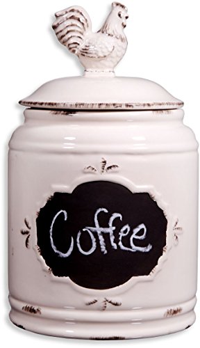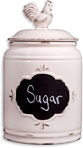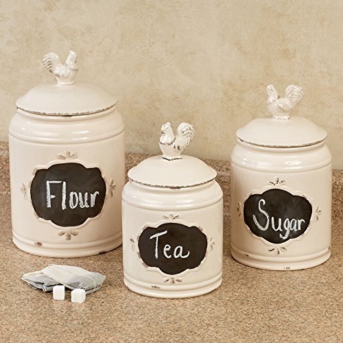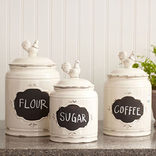 Set of 3 Ivory Ceramic Round Chalkboard Rooster Canister Jars with Tight Lids for Kitchen or Bathroom, Food Storage Containers,