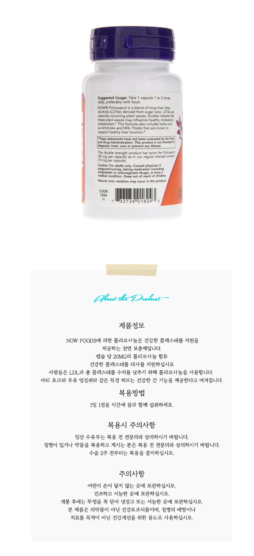 NOW FOOD POLICOSANOL 20MG PLUS 90 Veg Capsules*건강보조식품은 1회 통관시 6병까지만 통관 가능합니다.