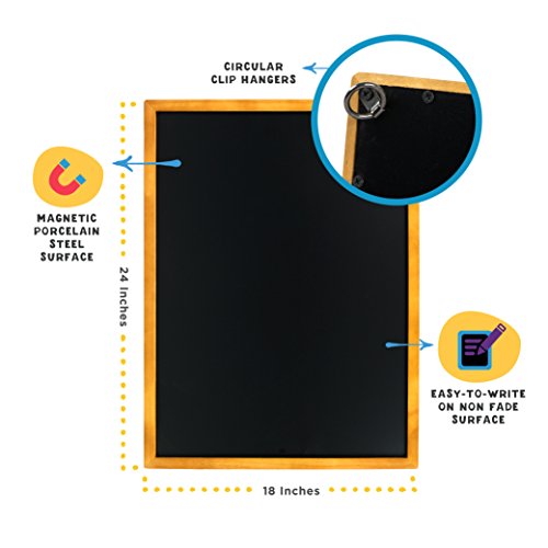 Enhance meetings with attention-grabbing visual aids, display café menu options or simply organize tasks with the dual purpose Porcelain Steel Magnetic Wall Mounted Chalkboard. This 24"x18" magnetic chalkboard with wooden frame was manufactured to the highest standards and comes with a set of circular clip hangers for easy mounting. Get the benefits of a magnetic tackboard and a non-ghosting, porcelain steel chalkboard with a fade-resistant surface for chalk marker ink all in one!