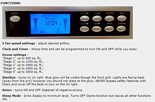 - 7 STAGES OF FILTRATION: pre-filter, HEPA filter, activated carbon filter, photo catalytic filter, ozone plate, UV light and Anion light