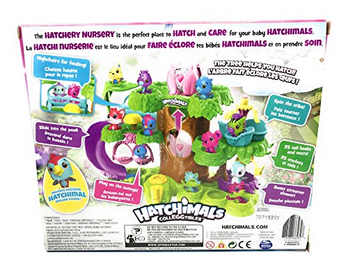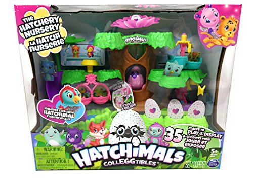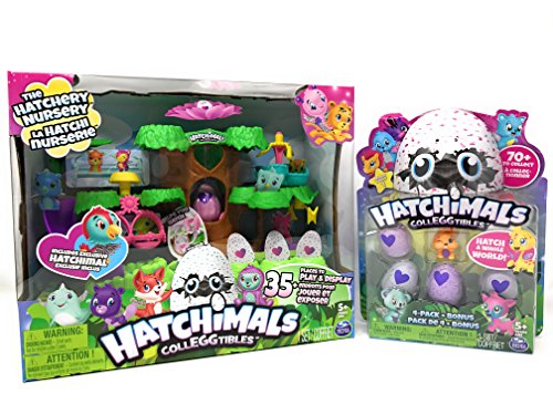 Hatchimals CollEGGtibles The Hatchery Nursery and 4-Pack + Bonus (Styles & Colors May Vary) Bundle includes: (1) Hatchimals CollEGGtibles The Hatchery Nursery [778988665848], and (1) Hatchimals CollEGGtibles 4-pack + Bonus (Styles & Colors May Vary). The Hatchery Nursery includes: (1) playset, (1) crank, (1) bench, (1) Hatchimals CollEGGtibles, and (1) instruction sheet. Hold the egg in your hands, rub the heart and watch it change from purple to pink, you'll know it's ready to hatch! Gently press to crack the egg and discover the Hatchimal CollEGGtible inside!