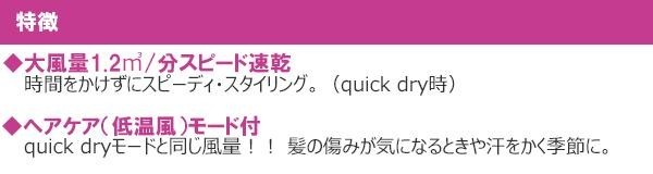 | 仕様 | 【電源】 AC100V 50/60Hz 【電源コードの長さ】 1.8m 【消費電力】 quick dry時:1200W hair care時:600W 【風量】 1.2m3/分 【スイッチポジション】 quick dry、hair care、cool、off 【温風温度】 quick dry時:約90度 hair care時:約60度 |