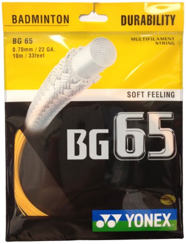Studio : Yonex Publisher : Yonex Binding : Misc. Product Description Yonex BG-65 badminton string is a high quality and durable string. One of the best sellers. The 0.70mm and special braided fiber reduces string abrasion providing extreme durability. Its all-around performance is highly trusted by world's top players. 0