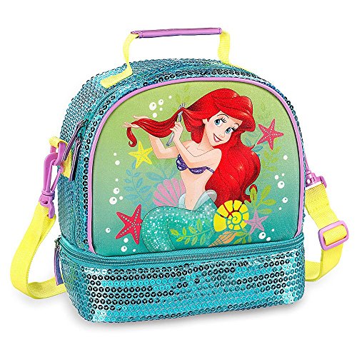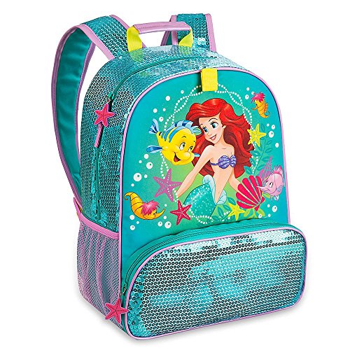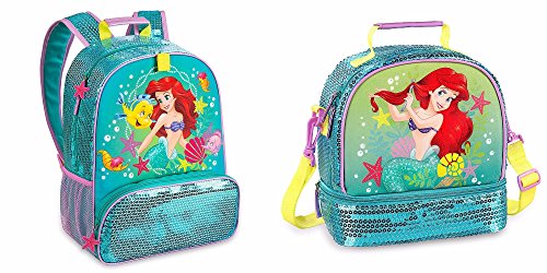 -. Brand : Disney -. Color : green -. Department : girls -. EAN : 0756519221923 -. Feature : Authentic Disney Store Product With Quality and Reliability / Front compartment with sequins and vinyl starfish zip pull The Little Mermaid screen art Sides and top covered in sequins / Double-pull zip top main compartment with one vinyl starfish zip pull Interior ID label Mesh interior pocket with self-stick fabric fastener Two mesh exterior side pockets Top carry handle / Adjustable padded shoulder straps with sequins and purple PVC piping Padded back with embroidered shell Accessory loop with self-stick fabric fastener / Set with Backpack and attachable Lunch Tote. ***Water Bottle NOT Included*** -. PackageQuantity : 1 -. ProductGroup : Apparel -. ProductTypeName : LAGE -. Size : large -. Title : Disney Store Deluxe Ariel The Little Mermaid Backpack and Lunch Tote Combo -. UPC : 756519221923