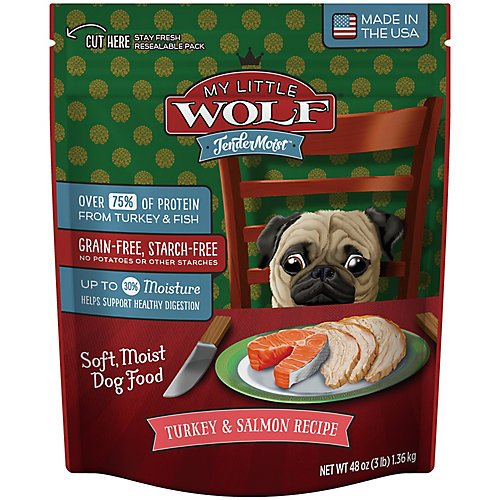 American Nutrition Corp TENDERMOIST TRKY/SALM 3LB DOG. American Nutrition Corp TENDERMOIST TRKY/SALM 3LB DOG. My Little Wolf Turkey and Salmon Tender Moist Dog Food My Little Wolf Tender Moist is formulated to be a complete and balanced meal for dogs of all life stages. It is a semi moist food made to be highly appetizing to your dog's palate. It starts with real turkey and salmon, providing over 70% of protein. It helps support healthy digestion with up to 30% moisture. It is grain and starch free, making it ideal for dogs with food sensitivities. Features: Made in the USA For dogs of all life stages.Feature