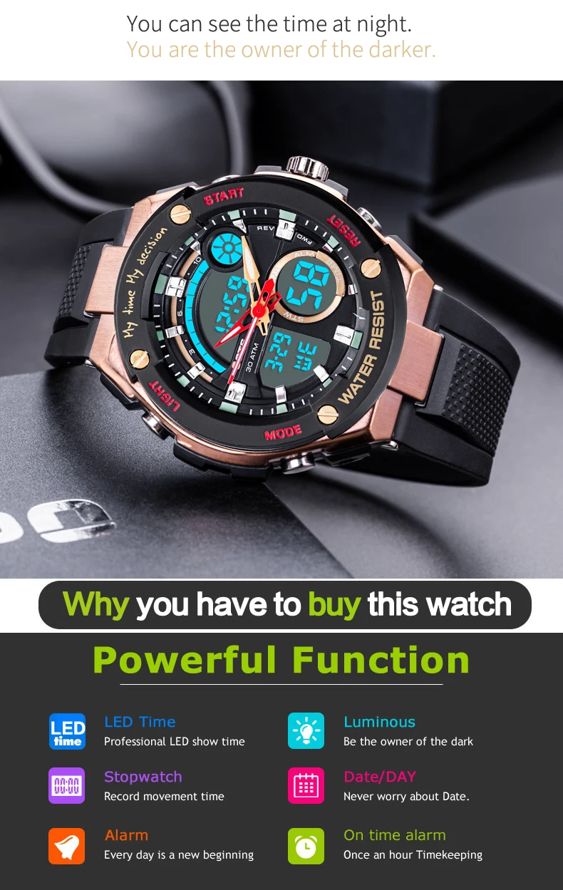 Feature:Back Light,Alarm,Water Resistant,Repeater,Stop Watch,Complete Calendar,Multiple Time Zone,Week Display,Auto Date,LED display