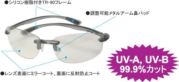 紫外線を目に呼び込みにくいとされる色の薄いサングラスレンズを装着しています。また、レンズ表面にミラーコートを施し、可視光線透過率を抑え、裏面には反射防止加工をしているので不快な目の映り込みをなくします。フレームには超弾性素材TR-90を使用し、耳あて部分にシリコン樹脂がついているのでフィット感が良くズリ落ちません。鼻あて部分も調整可能なパッドを使用しています。しかも重量が約18gと超軽量です。 |