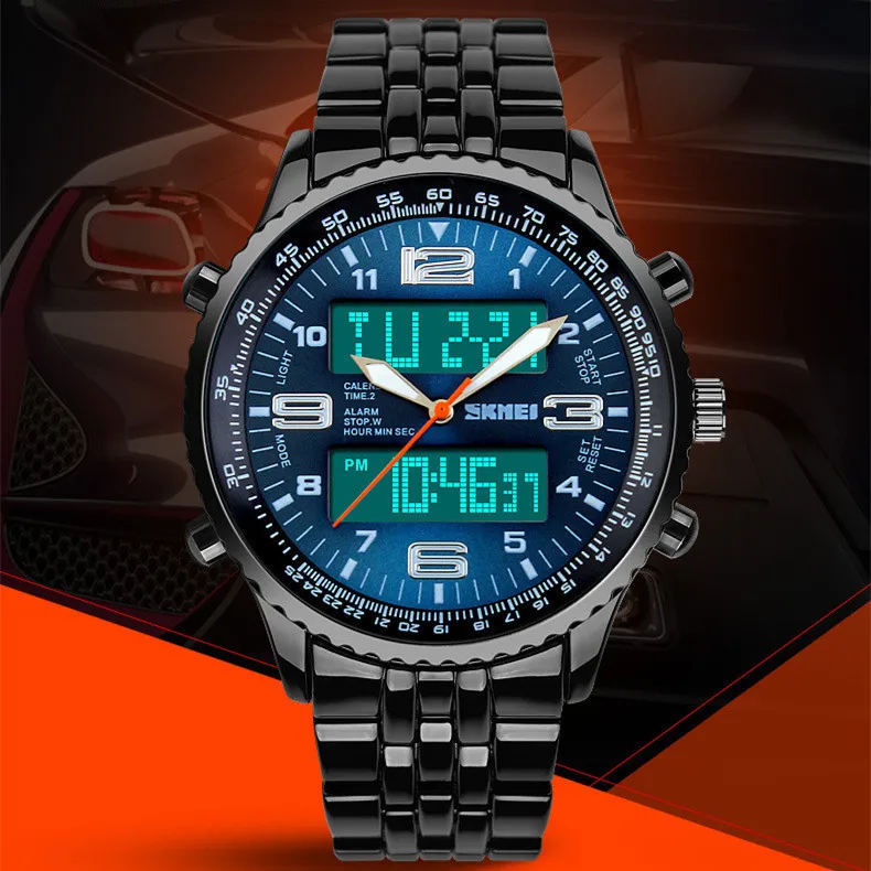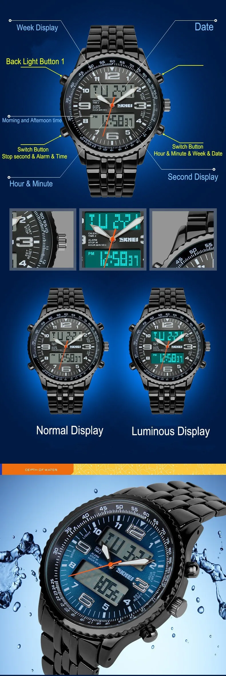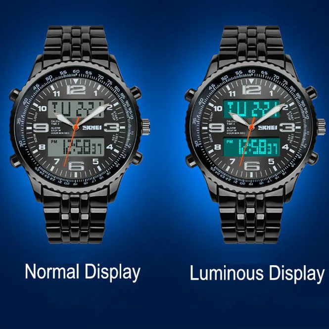Feature:Back Light,Alarm,Water Resistant,Multiple Time Zone,Chronograph,Stop Watch,Complete Calendar,Auto Date,LED display
