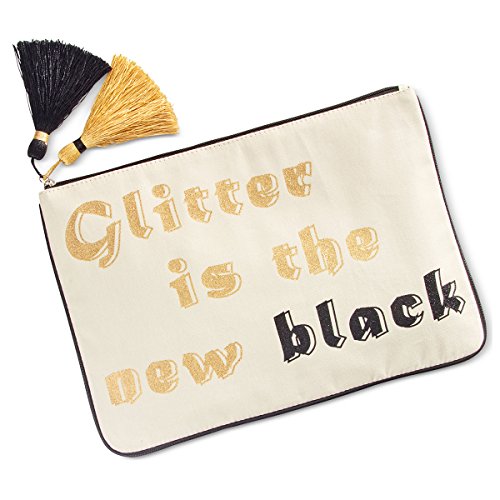 - "Glitter is the New Black" is featured on the front; Multicolored tassels featured on zipper
